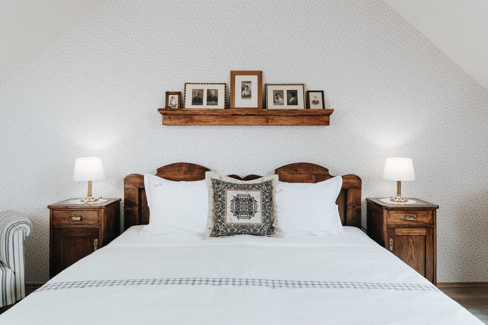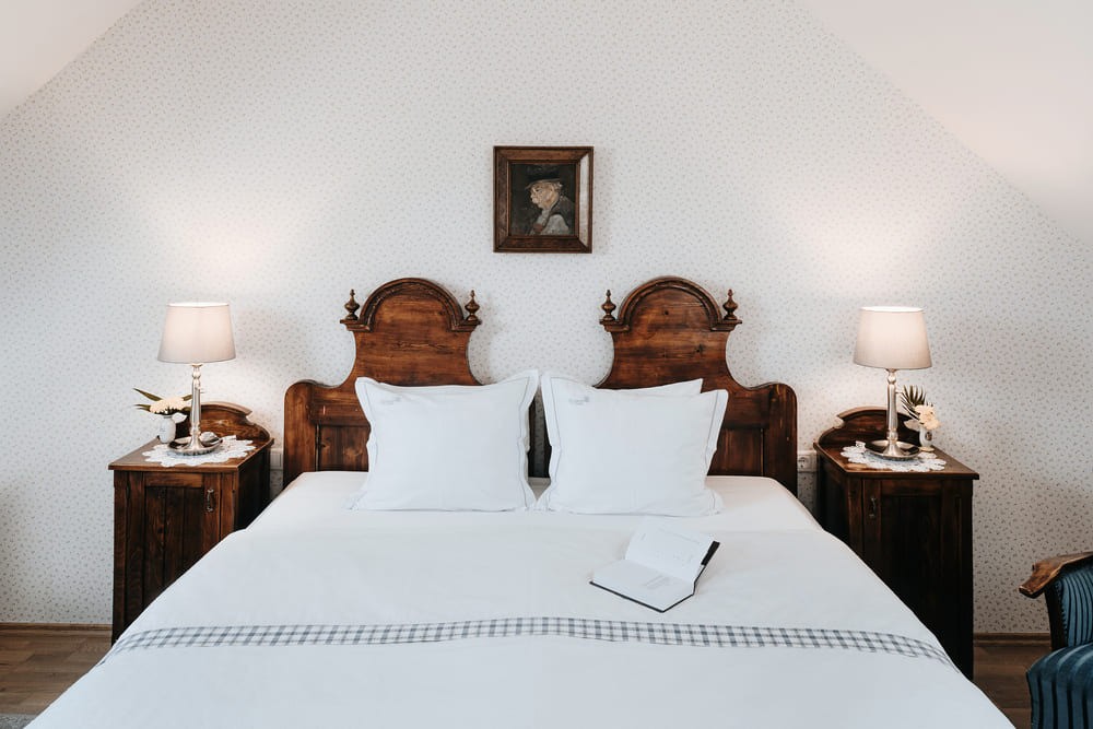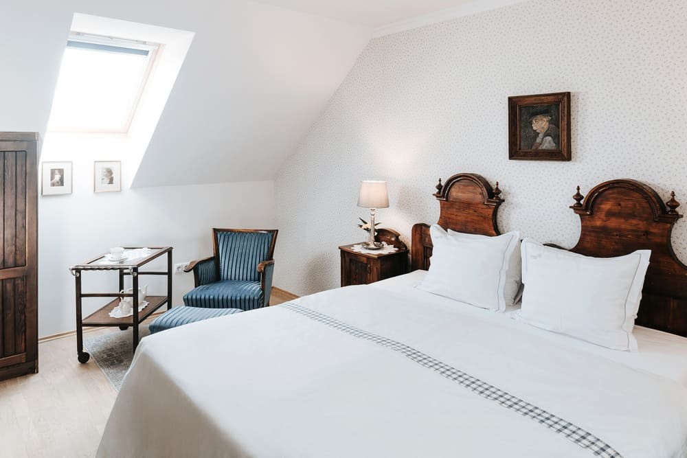 Két, emeleti, tágas, világos, franciaágyas (külön ágyazható: 2 x 90x200 cm) kutyabarát szoba, nem pótágyazható. Szekrény, asztal, fotel, szék és zuhanyzós fürdőszoba biztosítja a kényelmet. Az előtérben hűtőszekrény, a szobában szerviztálca várja tea- kávé bekészítéssel. Modern hőcserélős szellőztető friss levegőt, a tető extra szigetelése pedig kellemes hőmérsékletet biztosít nyáron is.